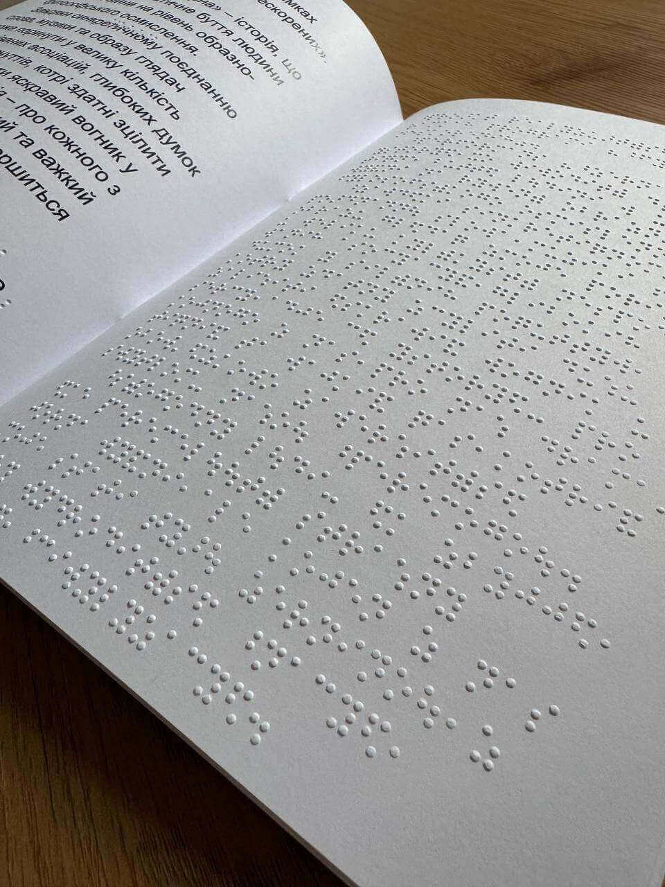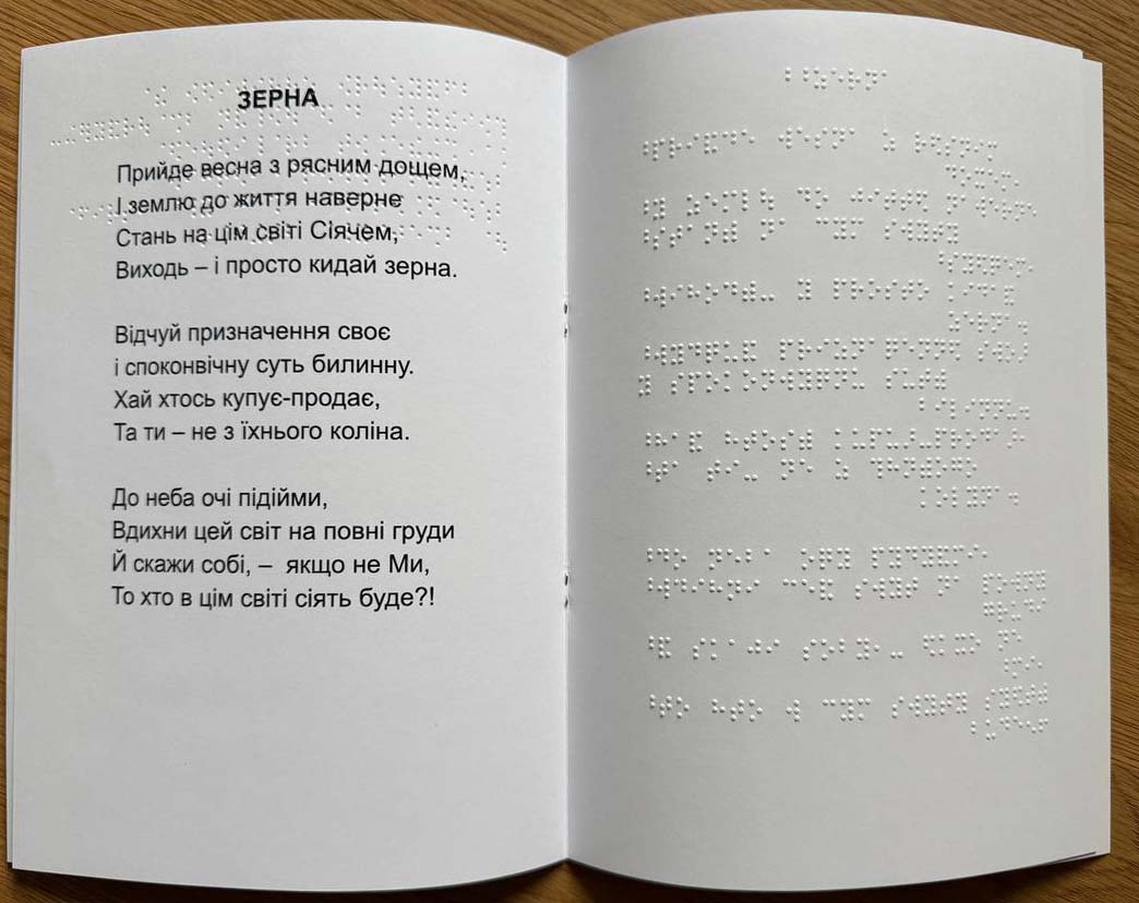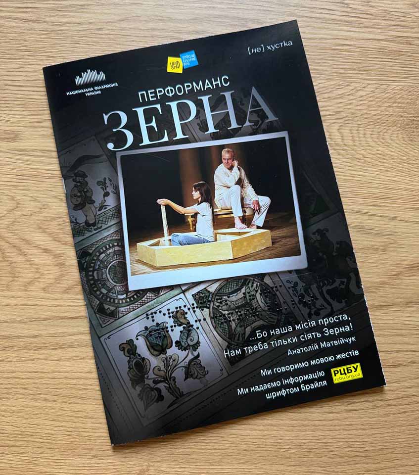 Інклюзивна програмка, створена спеціально для перформансу “Зерна” у Національній філармонії України. Тверда палітурка на обкладенці містить наліпку з назвою шрифтом Брайля. На розвороті з однієї сторони надрукована програма заходу та вірш збільшеною кирилицею, а з іншої — інформація дубльована шрифтом Брайля. Формат А4, виконана з цупкого паперу, приємного на дотик і зручного у використанні.